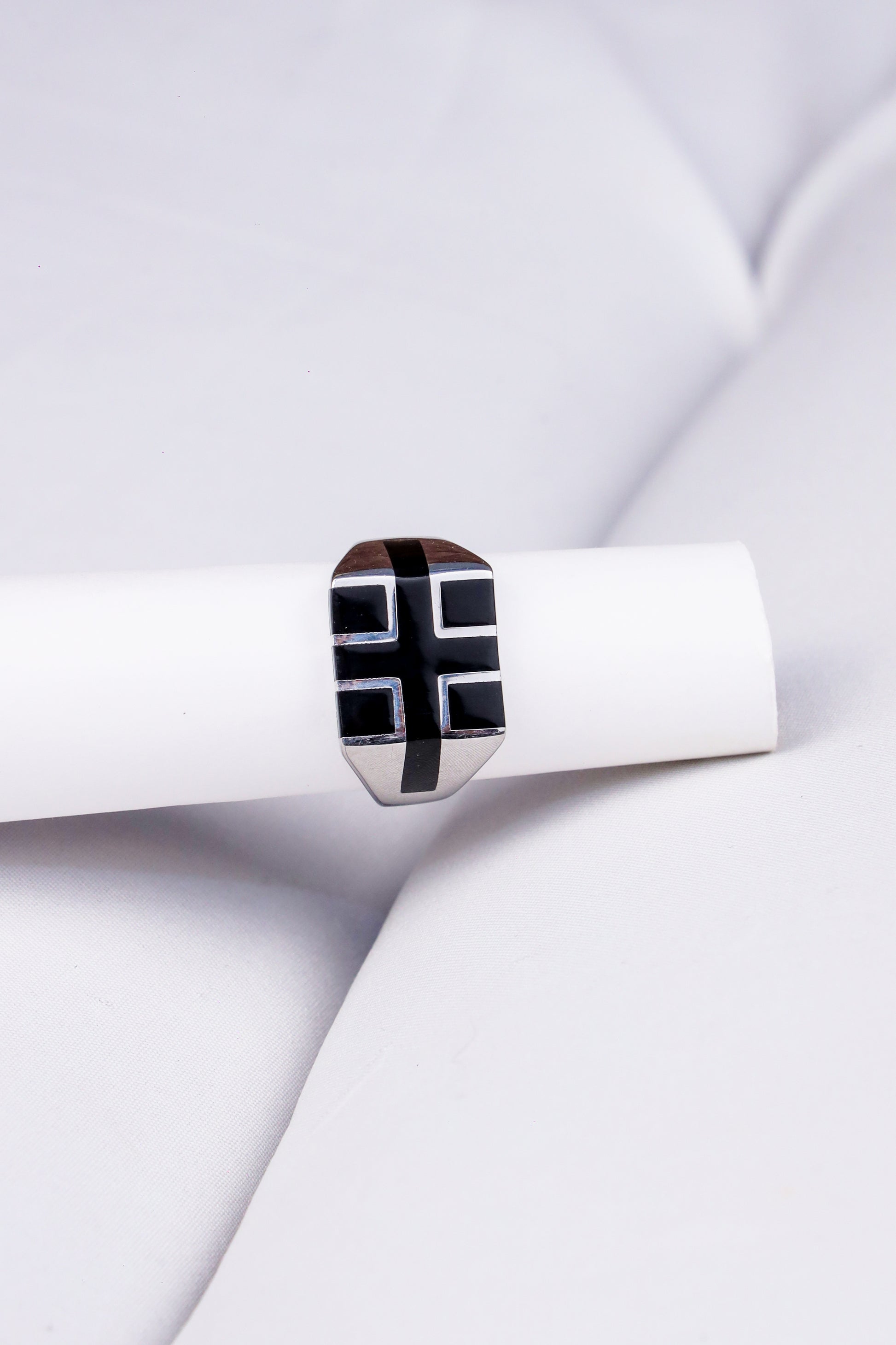 This striking Black Enamel Cross Design Men's Ring is crafted with a bold and modern look, perfect for those who like to make a strong style statement. Featuring a sleek silver-tone base with a bold black enamel inlay forming a geometric cross pattern, this ring embodies strength, confidence, and contemporary elegance. Its unique design makes it an ideal accessory for everyday wear or special occasions, adding a touch of masculinity and sophistication to any outfit.