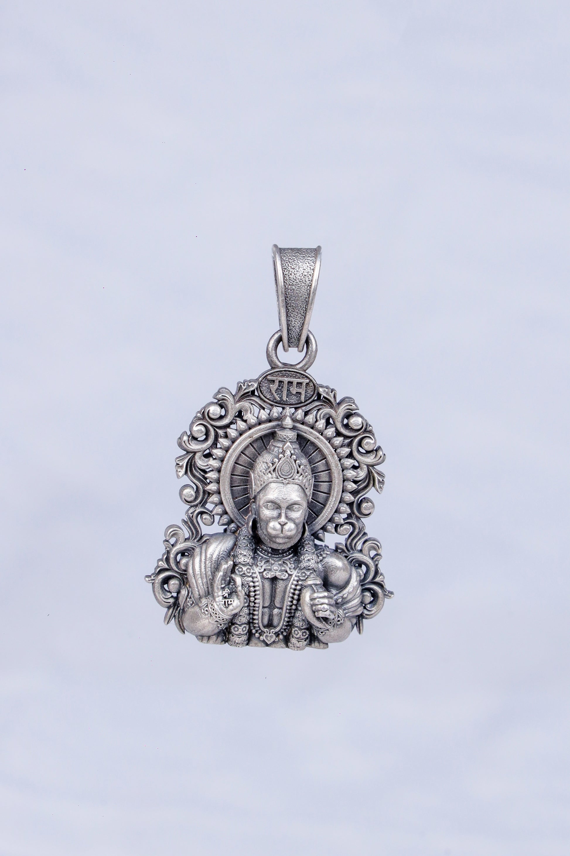 This exquisitely detailed silver pendant showcases Lord Hanuman in a majestic form, adorned with intricate carvings and divine aura. Lord Hanuman, the symbol of strength, devotion, and protection, is depicted holding a mace (gada) and sacred ornaments, radiating spiritual energy. The beautifully designed frame with floral and ornamental patterns enhances its divine appeal. Perfect for devotees seeking blessings of courage, wisdom, and protection, this pendant is ideal for everyday wear, temple visits, or as a sacred gift for loved ones.