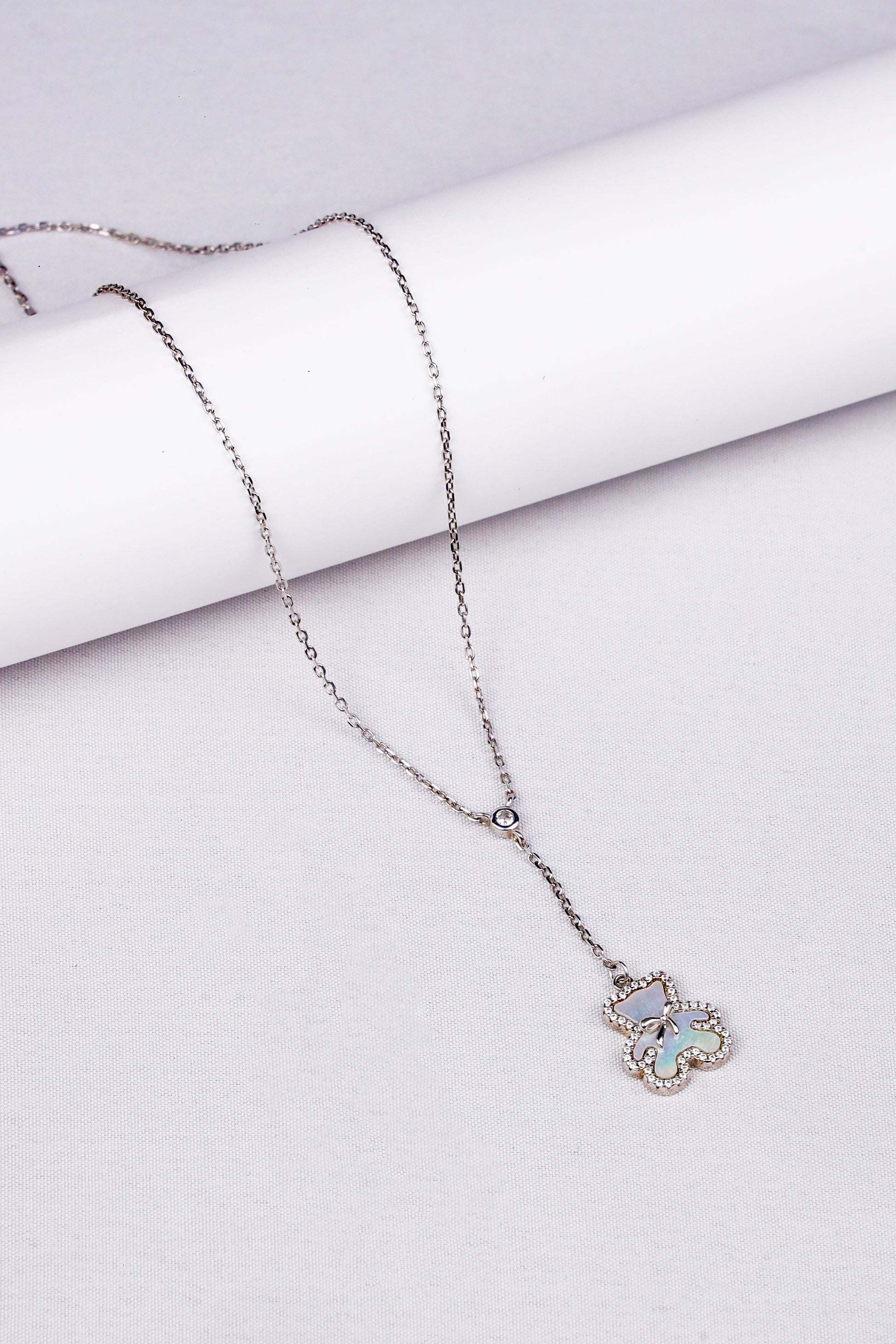 Add a touch of timeless elegance to your look with this beautifully crafted clover pendant necklace. Made from genuine 925 sterling silver, this delicate piece features a four-leaf clover design, symbolizing luck and grace. The pendant is accented with a fine border of shimmering stones, suspended from a fine silver chain with a single sparkling accent bead. Perfect for both everyday wear and special occasions, this necklace is a charming addition to any jewelry collection.