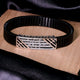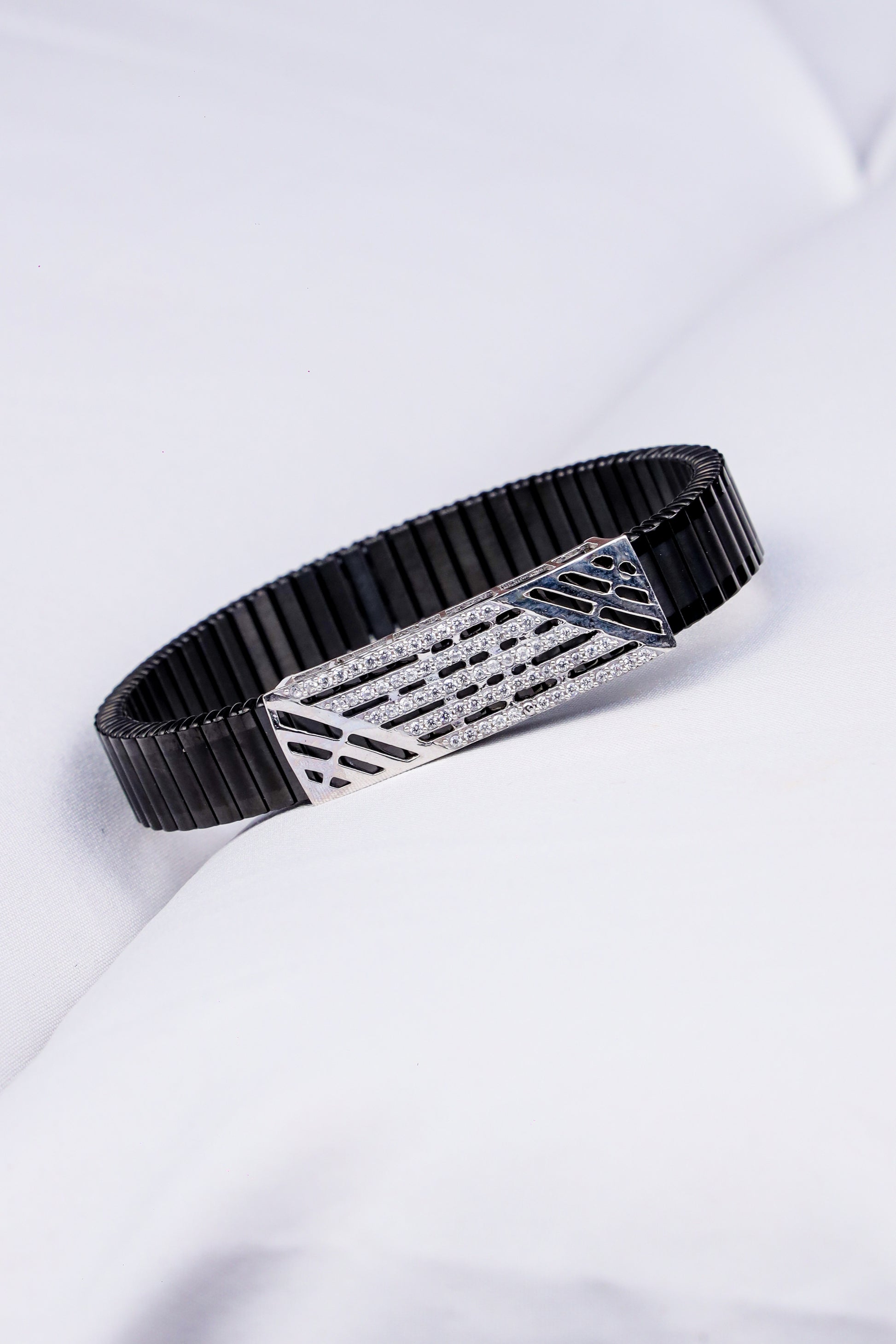 Elevate your style with this sleek men’s bracelet crafted with a flexible black stretch band for all-day comfort. The centerpiece showcases a bold silver geometric design enhanced with shimmering stone details, making it the perfect blend of elegance and masculinity. Ideal for casual wear, parties, or gifting.